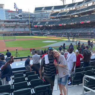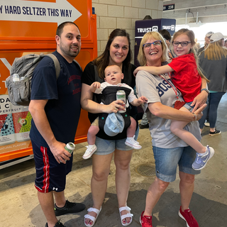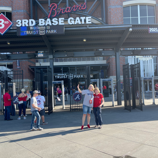 Our actual seats were the next level up (on the third base/Red Sox side) so we decided to go up there to get situated before getting ourselves some dinner. As the universe would have it, I also had another happy thrill ahead of me. On my birthday (the day before the game) my friend Reilly had texted me Happy Birthday wishes and I happened to mention to her that I was going to be seeing my Sox in Atlanta the following day. Well...as luck would have it, Reilly and her adorable family were going to be at that same game since they were driving through Atlanta on their way down to Florida for a Disney cruise! So after meeting Pokey and finding my seats, my next job was to figure out how the heck to meet up with Reilly in this big ass stadium! With lots of texting and much time and confusion (and stress) we were able to meet up for some much missed hugging and a quick catch up! I love her and her hubby and sweet daughter, McKenna, and I also got to finally meet her almost 9-month old son Spencer!! It really was a GIFT for the heart and we caught up again for more hugging (and photo ops) before they left. Reilly will always have a special place in my heart, so it was a definite “Life is Good” moment. Oh, and her presence at the game also provided us with an additional witness that Karl and I were on the jumbotron at Truist Park!!!